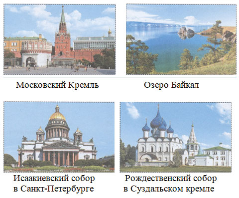 5. Узнай памятники природы и культуры России по фотографиям. Вырежи фотографии из Приложения и расположи их в соответствующих окошках (с. 62-63). Попроси соседа по парте проверить тебя. После проверки наклей фотографии.