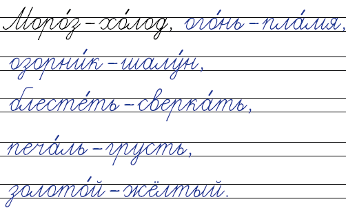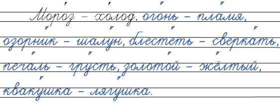 Моро́з - хо́лод, ого́нь - пла́мя, озорни́к - шалу́н, блесте́ть - сверка́ть, печа́ль - гру́сть, золото́й - жё́лтый, кваку́шка - лягу́шка.