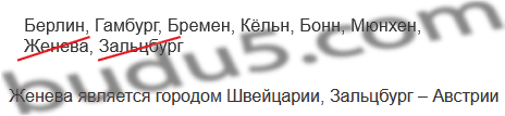 5. Серёжа получил задание перечислить города Германии. Он сказал: "Берлин, Гамбург, Бремен, Кёльн, Бонн, Мюнхен, Женева, Зальцбург".