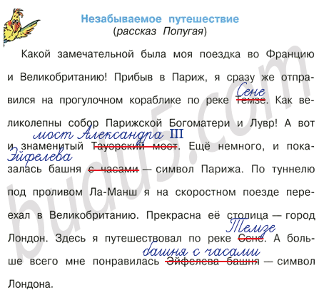 7. Наш неутомимый Попугай вернулся из путешествия и торопится поделиться впечатлениями. Но всё ли верно в его рассказе? Прочитай рассказ и исправь ошибки (зачеркни и напиши правильно).
