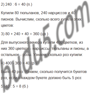 Задание № 78. Для выпускного вечера купили 400 цветков. Из них 80 тюльпанов, нарциссов - в 3 раза больше, чем тюльпанов, пионов - в 6 раз меньше, чем нарциссов, а остальные - розы. Сколько получится букетов роз, если в каждом букете должно быть 5 роз?