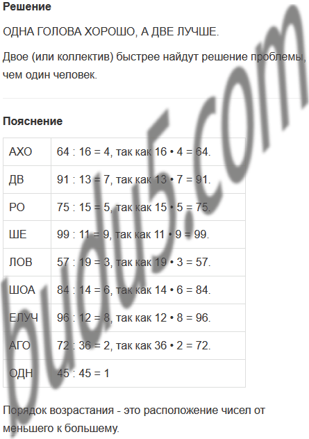 Задание № 82. Как разделить двузначное число на двузначное? Расположи ответы примеров в порядке возрастания и расшифруй пословицу. Как ты её понимаешь?