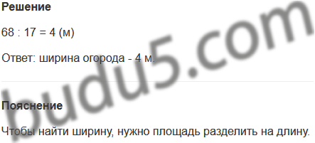 Задание № 83. Площадь огорода прямоугольной формы равна 68 м2, а его длина - 17 м. Найди ширину огорода.