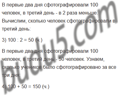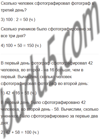 Задание № 89. В конце учебного года фотограф сделал снимки учеников. В первый день он сфотографировал 42 человека, во второй - на 16 человек больше, чем в первый, а в третий день - в 2 раза меньше, чем в оба предыдущих дня вместе. Сколько учеников было сфотографировано за все три дня?