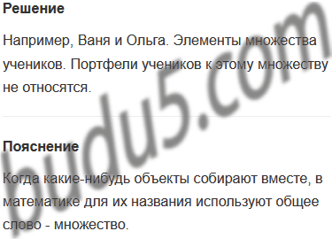 Задание № 4. Назови двух учеников твоего класса. Элементами какого множества они являются? Принадлежат ли этому множеству портфели учеников?