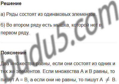 а) Сравни элементы множеств в первом и во втором рядах. Есть ли в первом ряду элемент, которого нет во втором ряду? Есть ли во втором ряду элемент, которого нет в первом ряду?