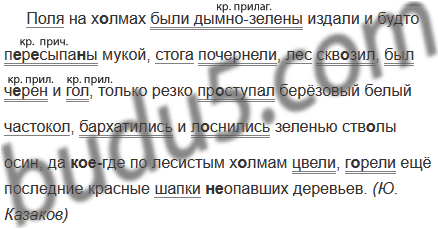 Поля на х..лмах были дымно-зелены издали и будто п..р..сыпа(н, нн)ы мукой, стога почернели, лес скв..зил, был ч..рен и гол, только резко преступал берёзовый белый частокол, бархатились и л..снились зеленью ств..лы осин, да (кое)где по лесистым х..лмам цвели, г..рели ещё последние красные шапки (не)опавших деревьев. (Ю. Казаков)