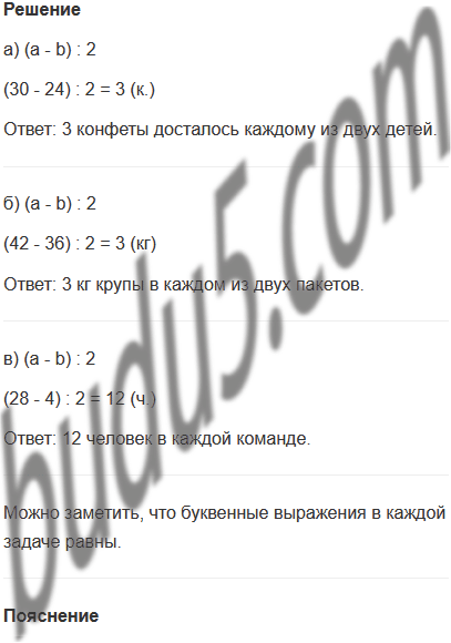 б) В мешке было а кг крупы. Из них израсходовали b кг, а остальную крупу рассыпали поровну в 2 пакета. Сколько килограммов крупы в каждом из этих пакетов? (а = 42, b = 36)