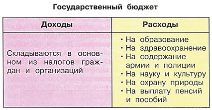 В таблице мы видим, что доходы государства складываются из налогов граждан и организаций. А расходы распределяются по нескольким направлениям.