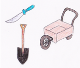 Овощевод продаёт картофель. Ему нужны лопата и тачка.