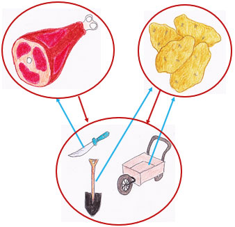 Овощевод тоже поменяется с кузнецом: даст ему картофель, а взамен получит от кузнеца тачку и лопату. О количестве картофеля за лопату и тачку будут договариваться на месте.