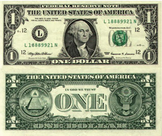 Один доллар США. На лицевой стороне современной банкноты изображён портрет первого президента Джорджа Вашингтона, написанный Гилбертом Стюартом.