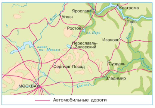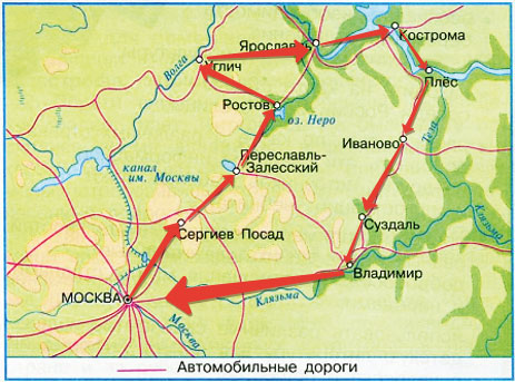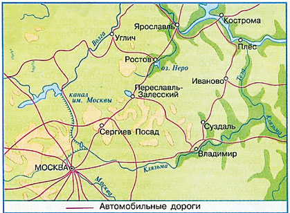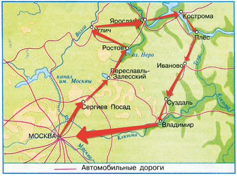 ♦ Проследи по карте маршрут нашего путешествия: Сергиев Посад – Переславль-Залесский – Ростов – Углич – Ярославль – Кострома – Плёс – Иваново – Суздаль – Владимир.