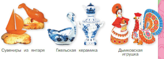 Сувениры из янтаря можно привести из Калининграда, гжельскую керамику - из московской области, дымковскую игрушку - из Кирова.