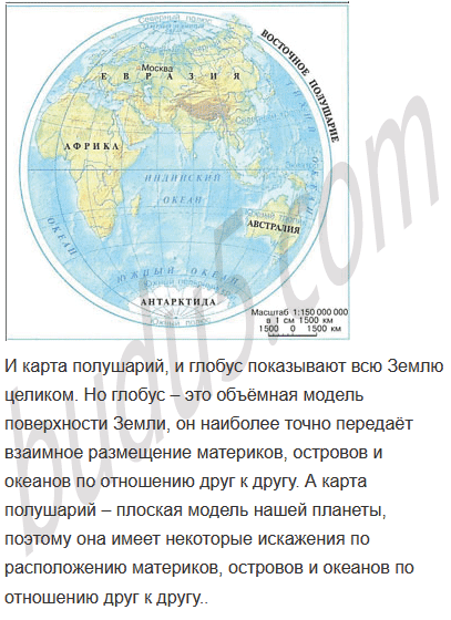 И карта полушарий, и глобус показывают всю Землю целиком. Но глобус – это объёмная модель поверхности Земли, он наиболее точно передаёт взаимное размещение материков, островов и океанов по отношению друг к другу. А карта полушарий – плоская модель нашей планеты, поэтому она имеет некоторые искажения по расположению материков, островов и океанов по отношению друг к другу..