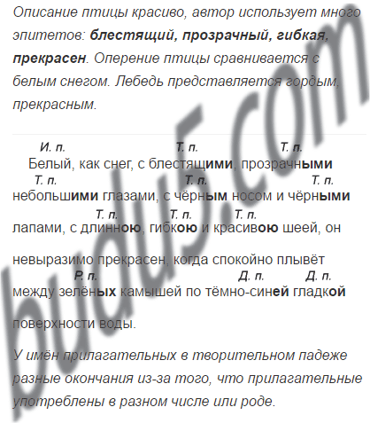 Белый, как снег, с блестящими, прозрачн... небольш... глазами, с чёрн... носом и чёрн... лапами, с длинн..ю, гибк..ю и красив..ю шеей, он невыразимо прекрасен, когда спокойно плывёт между зелёных камышей по тёмно-син... гладк... поверхности воды.
