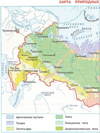 Основные природные зоны России: арктические пустыни, тундра, тайга, смешанные и широколиственные леса, степи, пустыни, субтропики.