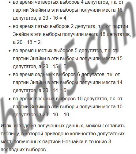 В городском совете Солнечного города представлены две партии: партия Знайки и партия Незнайки. Всего в городском совете 20 мест. В таблице приведено количество депутатских мест, полученных партией Знайки в течение 8 последних выборов.