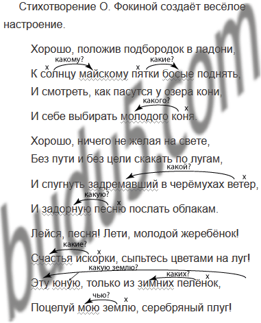 Прочитайте фрагмент стихотворения О. Фокиной. Какое настроение создаёт в нём автор? Найдите в данном фрагменте определения. На какие вопросы они отвечают и словами каких частей речи являются?