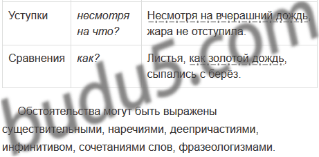 Прочитайте теоретический материал о видах обстоятельств и представьте его в форме таблицы, в которой обязательно приведите свои примеры. Словами каких частей речи могут быть обстоятельства? Включите ответ на этот вопрос в свою таблицу.