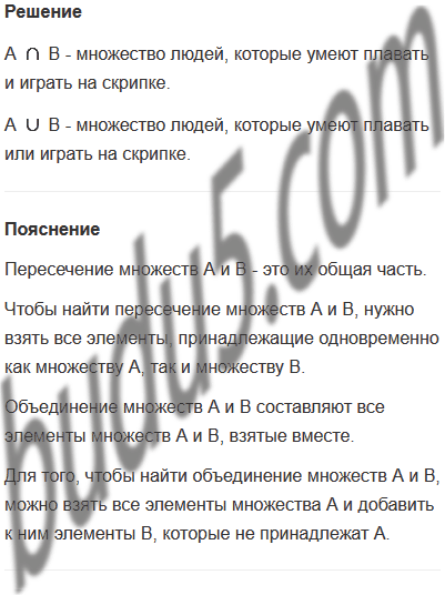 Задание № 3. А - множество людей, умеющих плавать, В - множество людей, умеющих играть на скрипке. Что представляют собой множества А