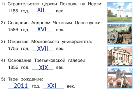 2. С помощью "ленты времени", помещённой в учебнике, или самостоятельно определи, в каком веке произошли эти события. Обозначь века с помощью римских цифр.