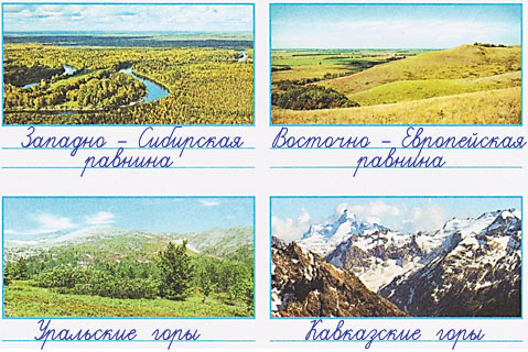 Слова для справок: Кавказские горы, Восточно – Европейская равнина, Уральские горы, Западно – Сибирская равнина.