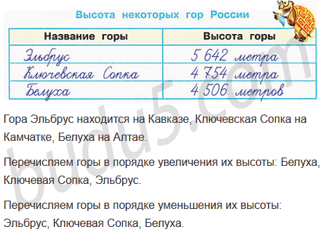 С помощью карты объясните (устно), где находится каждая гора. Используя данные таблицы, сравните горы по высоте. Перечислите горы в порядке увеличения их высоты; в порядке уменьшения их высоты.