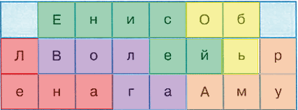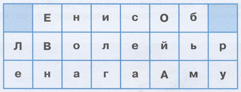 4. Вот какое задание предлагают тебе Серёжа и Надя. Среди этих букв "спрятались" названия крупнейших рек России. Найди их и закрась карандашом разного цвета.