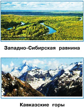 3. Научись узнавать равнины и горы по фотографиям. Вырежи фотографии из Приложения. Подумай, по каким признакам можно узнать эти географические объекты. Помести фотографии в соответствующие окошки. Попроси учителя проверить твою работу. После проверки наклей фотографии.
