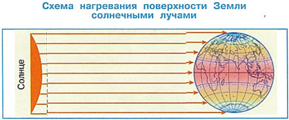 На схеме мы видим, что из-за круглой формы Земли в северных районах солнечные лучи падают на неё наклонно. Они скользят по поверхности Земли и слабо прогревают её. И чем южнее, тем сильнее солнечные лучи нагревают земную поверхность.