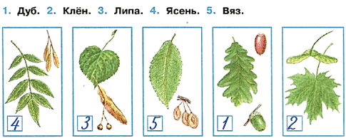 2) Узнайте лиственные деревья по листьям и плодам. Пронумеруйте рисунки.