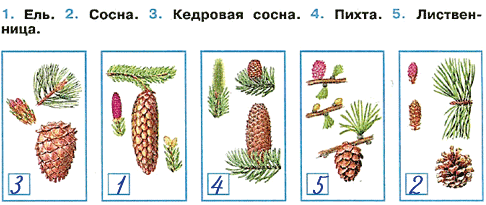 1) Узнаём хвойные деревья по веточкам и шишкам. Нумеруем рисунки.