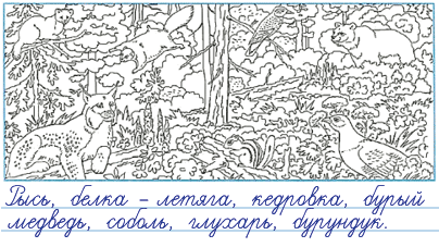 3) На этом рисунке "спрятались" 7 животных тайги. Найдите их и назовите. Составьте список животных, которых вам удалось отыскать на рисунке.