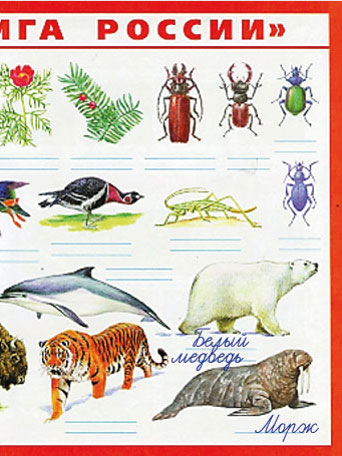 5. Папа Серёжи и Нади нарисовал плакат "Красная книга России" (в конце тетради). На нём показаны редкие растения и животные разных природных зон. Найди животных зоны арктических пустынь и подпиши их названия.