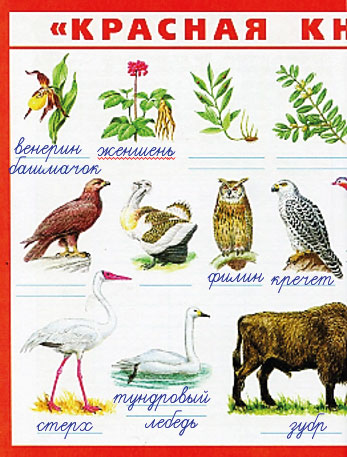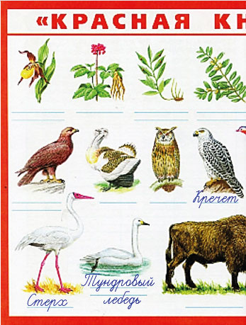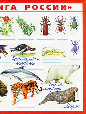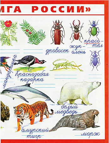 4. Продолжаем заполнение плаката "Красная книга России", который нарисовал папа Серёжи и Нади. Находим на плакате растения и животных лесных зон и подписываем их названия.