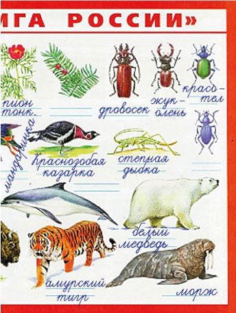 7. Продолжаем заполнение плаката "Красная книга России", который нарисовал папа Серёжи и Нади. Находим на плакате растение и животных степной зоны и подписываем их названия.