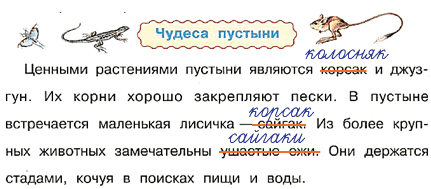 3. Наш эрудированный Попугай спешит рассказать о пустыне. Всё ли верно в его рассказе? Найди и исправь ошибки в тексте (зачеркни и напиши правильно).