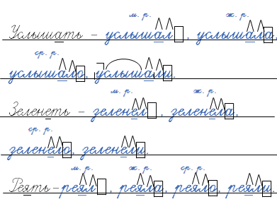 • Выделите в глаголах прошедшего времени суффиксы и окончания. Подчеркните одинаковые суффиксы в неопределённой форме и в формах прошедшего времени.
