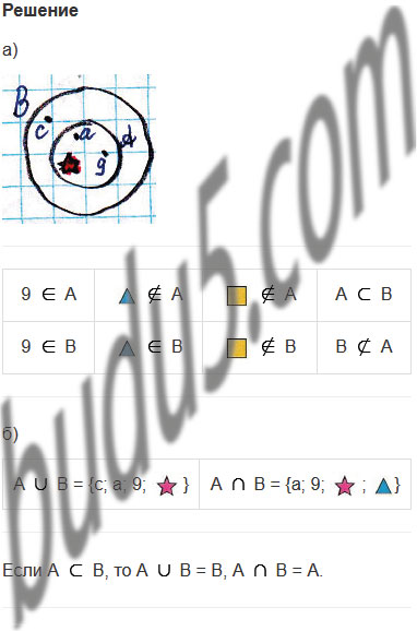 а) Назови элементы множеств А и В. Построй их диаграмму. Какое из множеств А и В является подмножеством другого? Сделай записи, вставляя знаки