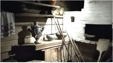 Экскурсовод рассказывала посетителям о нелёгкой жизни того времени. Это было видно по убранству дома и тем предметам, которыми пользовались жильцы. Например, большущая печь в избе, рядом на столе – чугунки, самовар. Хозяйкам приходилось долго трудиться над приготовлением пищи. Они топили печь, пекли в ней хлеб, в чугунках запекали картофель, варили щи. Рядом с печью стоит ухват для чугунков. При помощи ухвата ставили и доставали из печи горячие чугунки. Самовар тоже надо было разжечь, чтобы он закипел.