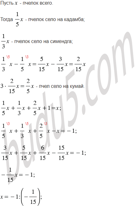 (Задача Бхаскары.) Есть кадамба цветок: на один лепесток пчёлок пятая часть села. Рядом росла вся в цвету симендга, и на ней третья часть разместилась. Разность их ты найди, затем трижды её сложи, на кумай этих пчёл посади. Только пчёлка одна не нашла себе места нигде, всё летала туда и сюда, запахом цветов наслаждалась. И скажи мне теперь, сколько пчёлок всего здесь собралось?