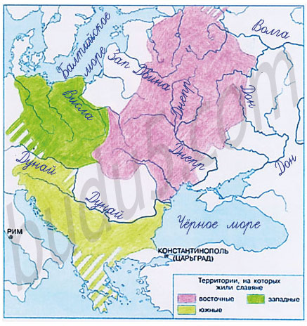 1. На контурной карте с помощью карты учебника (с. 35) раскрась различными цветами территории, на которых жили восточные, западные, южные славяне. Подпиши названия рек и морей.