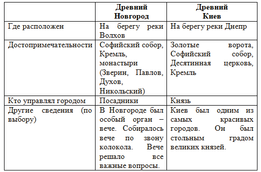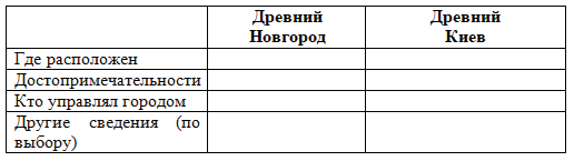 Используйте таблицу для подготовки сообщений о древнем Новгороде и древнем Киеве.