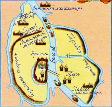 4. Узнаём по схемам города. Подписываем их названия. С помощью схем в учебнике надписываем названия главных архитектурных сооружений и рек.