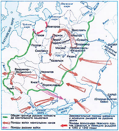 2) показываем стрелками походы: а) войск монголов; б) русских войск (в том числе Александра Невского против шведских и немецких рыцарей).