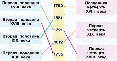К какому отрезку века относятся эти годы? Укажи разноцветными стрелками.