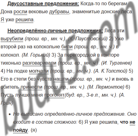 1) Когда-то по берегам Дона росли вековые дубравы, знаменитые донские леса. Леса эти вырубили. (К. Паустовский) 2) Уже второй раз на колокольне били в колокол. (М. Горький) 3) За перегородкой в конторе тихонько разговаривали. (И. Тургенев) 4) На лодке молчали. (А. К.Толстой) 5) Его в степи без чувств нашли и вновь в обитель принесли. (М. Лермонтов) 6) Я уже решила, что не пойду. Пусть лучше меня прогонят. (А. Грин)