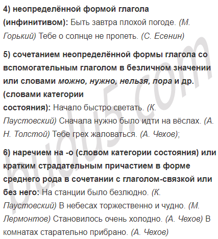 1) сочетанием неопределённой формы глагола со вспомогательным глаголом в безличном значении или словами можно, нужно, нельзя, пора и др. (словами категории состояния): Начало быстро светать. (К. Паустовский) Сначала нужно было идти на вёслах. (А. Н. Толстой) Тебе грех жаловаться. (А. Чехов); 2) наречием на -о (словом категории состояния) или кратким страдательным причастием в форме среднего рода в сочетании с глаголом-связкой или без него: На станции было безлюдно. (К. Паустовский) В небесах торжественно и чудно. (М. Лермонтов) Становилось очень холодно. (А. Чехов) В комнатах старательно прибрано. (А. Чехов) |