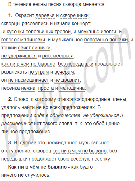 Прочитайте текст и определите его тему. Меняется ли песенка скворца в течение весны? Найдите в предложениях однородные члены.
